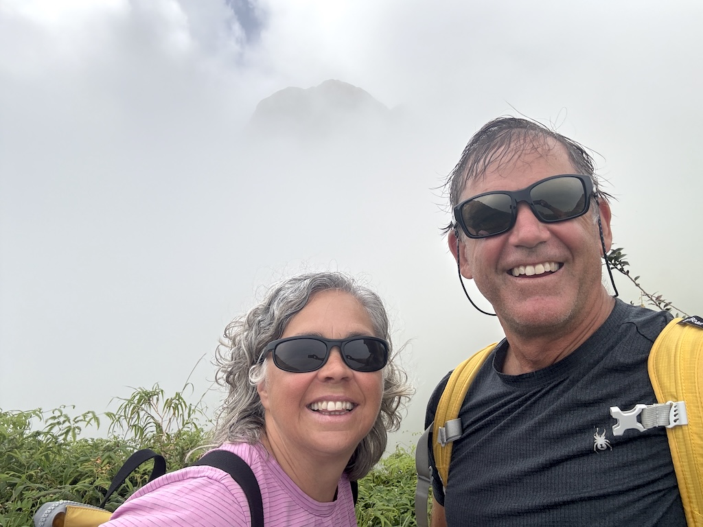 We had managed to avoid the rain, but clouds persisted on the steep accent to the first pass. Frustratingly, pains of osteoarthritis were cursing through my left knee, especially frustrating because just two months ago Karen and I had completed a four day high elevation trek on the Inca trail to Machu Picchu. Once again, the mysteries of the human body announce their ill-timed presence. For a teaser, we snuck in an ever-so-brief glimpse of the Mt Pelée summit as clouds parted.