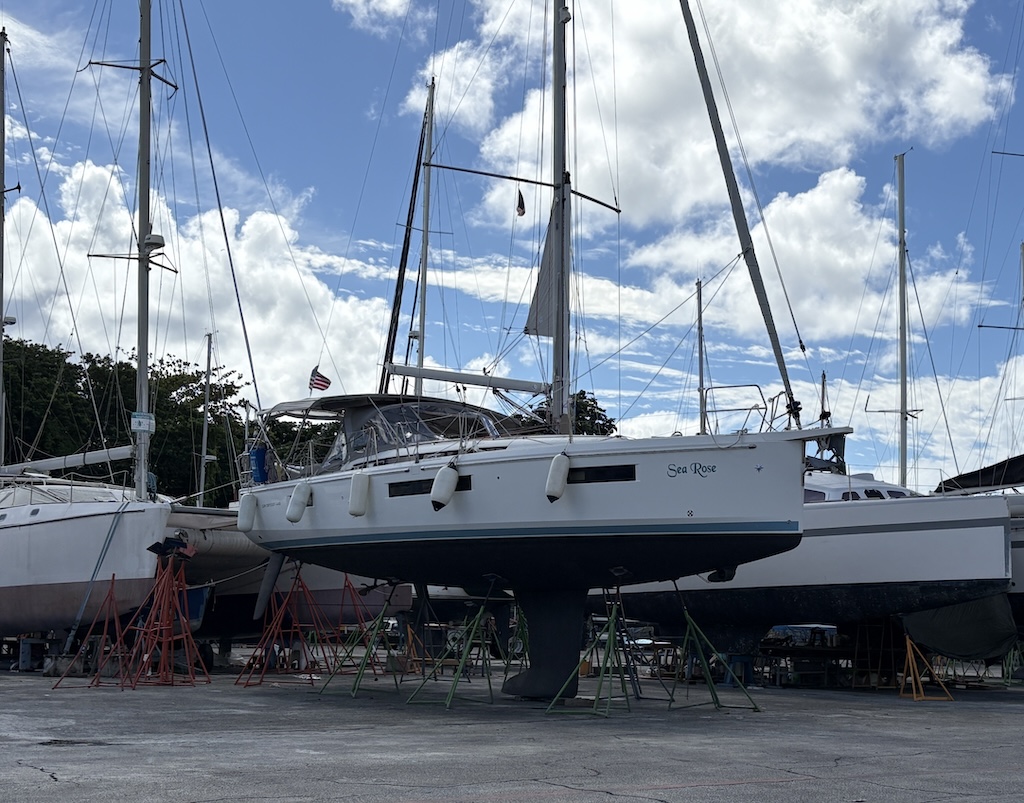 Sea Rose waiting patiently for her return to the water. Carenantilles shipyard, Le Marin, Martinique
