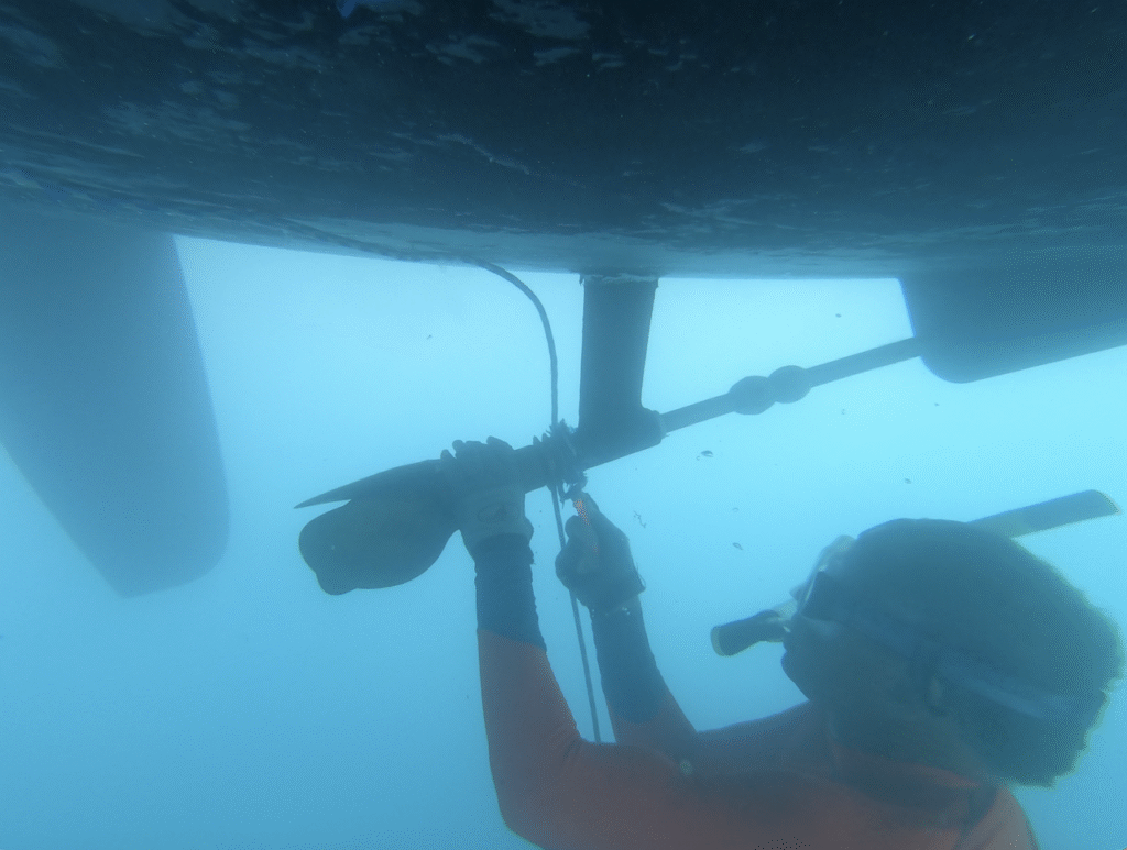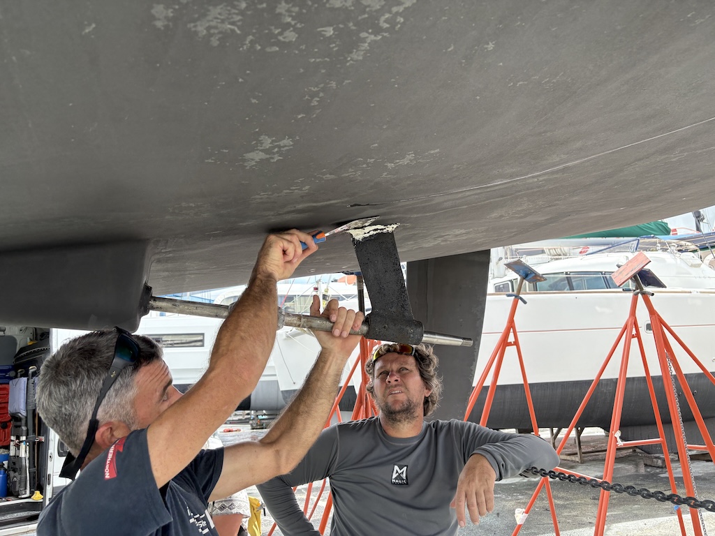 The smart minds of Le Marin assessing our propellor, bearing and skeg situation.