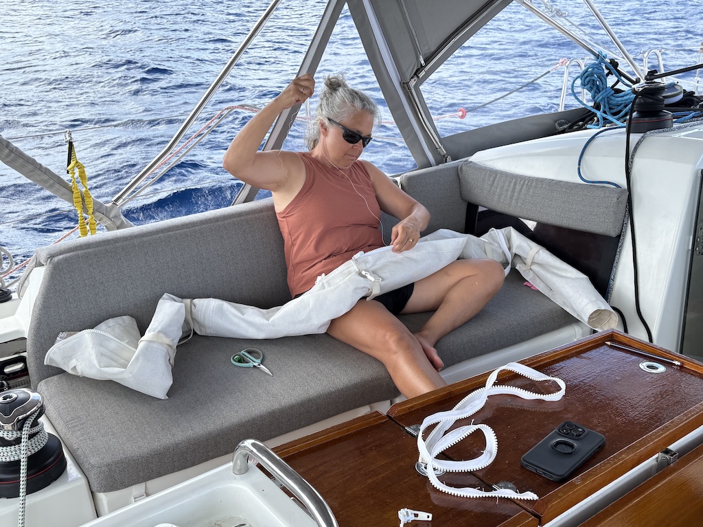 These interludes with friends make any work day more tolerable. And Le Marin, with its dizzying array of marine stores and technicians, is the place to come in the Caribbean to make progress on the ever present to-do list. We added a fourth Victron lithium battery to our house bank, giving us 1200 amp hours of reserve power. This is compared to less than 300 amp hours of usable power previously. Karen jumped into hand-sewn repairs to our sun shades, patiently completing a job that would have taken mere minutes on her Sailrite sewing machine back home. And, we hired a refrigeration technician to address our freezer, which seemed like it was running continuously in the high ambient heat of the Caribbean.